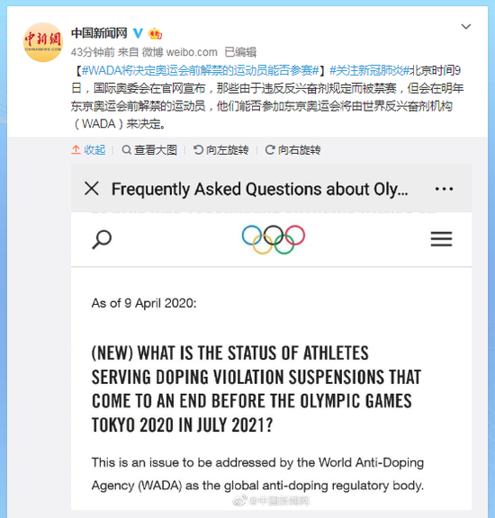北京时间9日,国际奥委会在官网宣布,那些由于违反反兴奋剂规定而被禁赛,但会在明年东京奥运会前解禁的运动员,他们能否参加东京奥运会将由世界反兴奋剂机构(WADA)来决定。