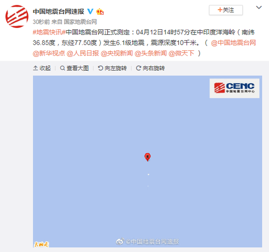 中国地震台网正式测定:04月12日14时57分在中印度洋海岭(南纬36.85度,东经77.50度)发生6.1级地震,震源深度10千米。