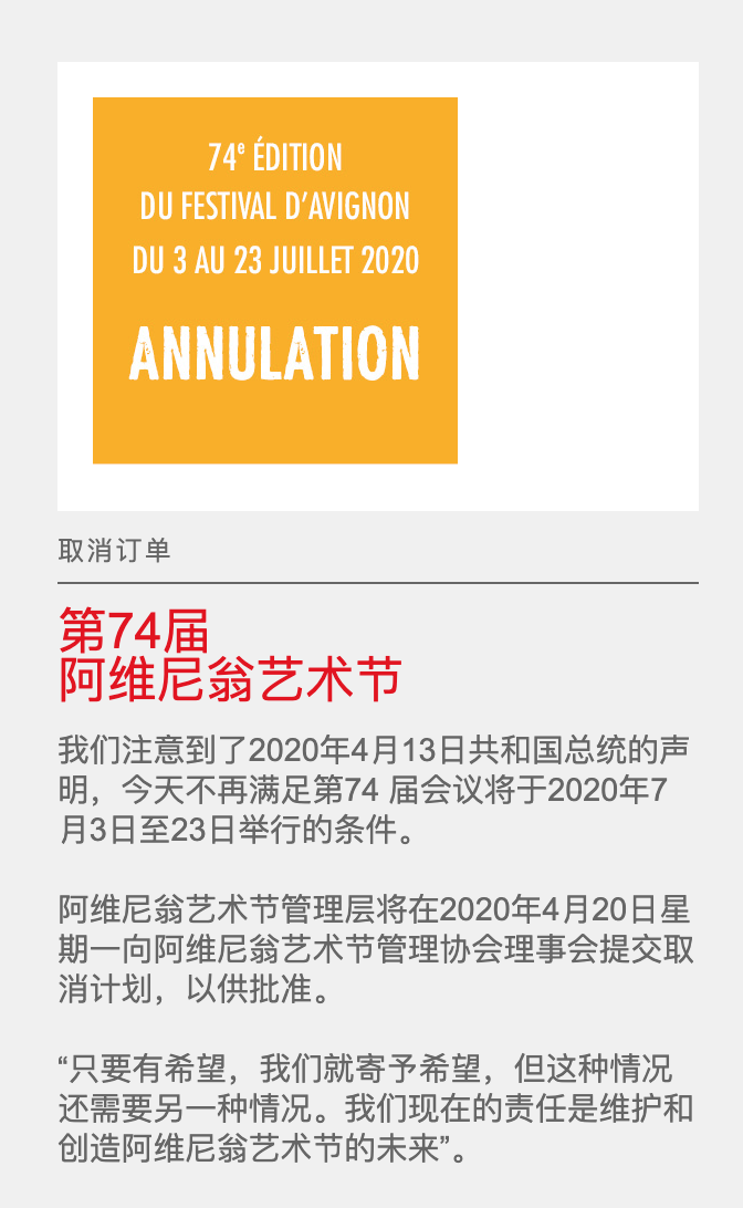 【环球网文化频道】继爱丁堡国际艺术节、柏林戏剧节取消之后,法国时间4月13日晚,阿维尼翁戏剧节组委会发布消息,2020年第74届阿维尼翁戏剧节取消。世界三大戏剧节今年均宣布取消。