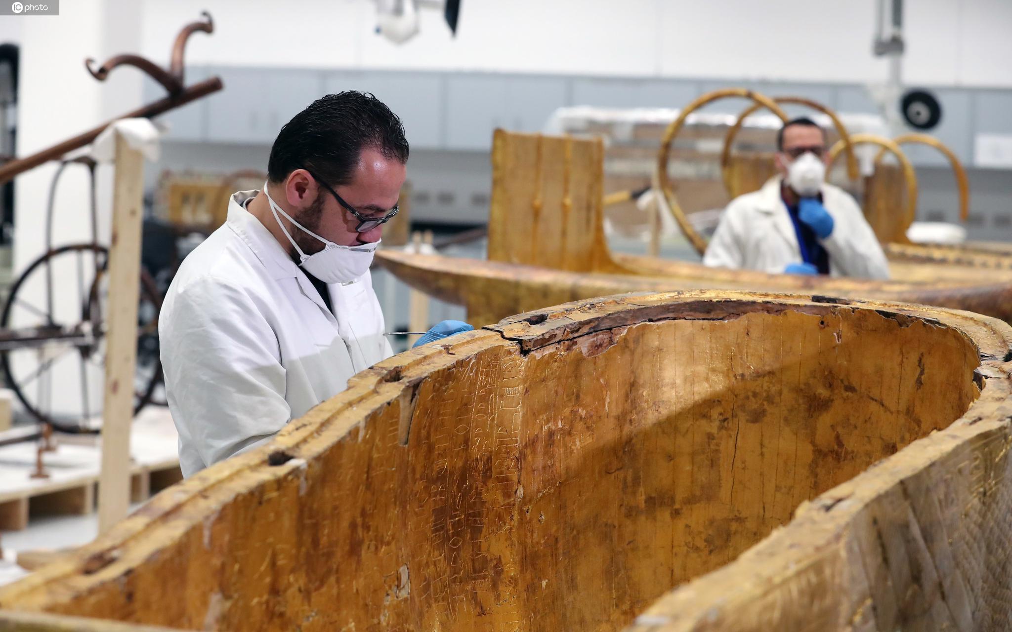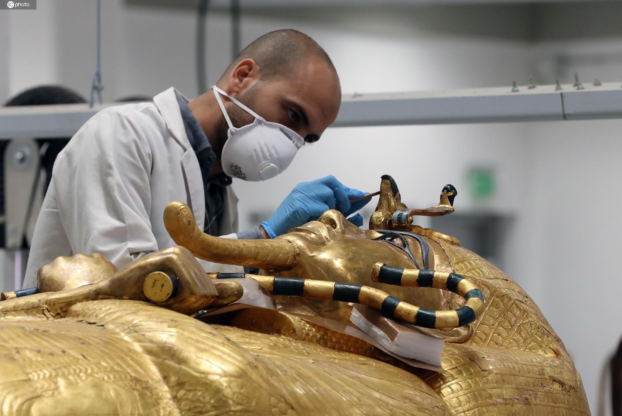 当地时间2020年4月13日,埃及吉萨,考古学家在大埃及博物馆中继续为图坦卡蒙法老的金棺进行修复工作