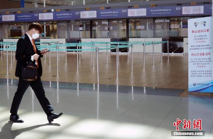 3月20日,韩国仁川国际机场,工作人员佩戴口罩走过机场大厅。中新社记者 曾鼐 摄