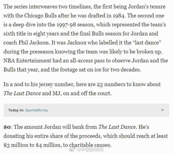 原标题:#乔丹将捐出个人纪录片收益分成#