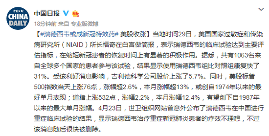 当地时间29日,美国国家过敏症和传染病研究所(NIAID)所长福奇在白宫做简报,表示瑞德西韦的临床试验达到主要评估指标,在缩短新冠患者的恢复时间上有显著的积极作用。据悉,共有1063名来自全球多个国家的患者参与该试验,结果显示使用瑞德西韦组比对照组康复快了31%。受该利好消息影响,吉利德科学公司股价上涨了5.7%。同时,美股标普500指数当天上涨76点,涨幅超2.6%,本月涨幅超13%,或创自1974年以来的最好单月表现;道指上涨532点,涨幅2.2%,本月涨幅12.4%,有望创下自1987年以来的最大单月涨幅。4月23日,世卫组织网站曾意外公布了瑞德西韦在中国进行重症临床试验的结果,显示瑞德西韦治疗重症新冠肺炎患者的疗效不理想,不过该消息随后很快被删除。