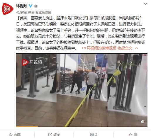 原标题:美国一警察暴力执法,猛摔未戴口罩女子