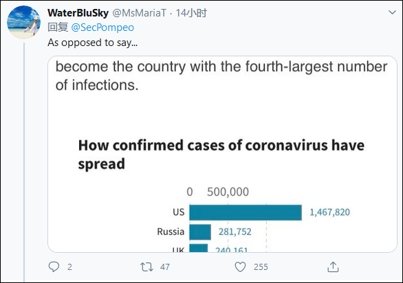 就在蓬佩奥这则推特的评论区,许多网友纷纷留言质疑他的观点,画风似乎和蓬佩奥所预想的完全不同。有人就留言说:“蓬佩奥看不见大家都在评论里讽刺他吗?”