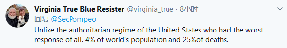 再往下翻,另一位网友的评论内容似乎呼应了上一位的问题,他直接形容美国才是真正的“集权”政体,特朗普政府应对疫情的表现最差。“美国约占全世界人口的4%,死亡人数却占全世界的25%”。(观察者网注:截至5月19日,实际应占28%)