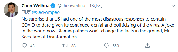 除了国外网友,《中国日报》欧盟分社社长陈伟华也对蓬佩奥的言论进行了回应,他模仿蓬佩奥所写推特的文法“以彼之道还施彼身”,获得了650个点赞。
