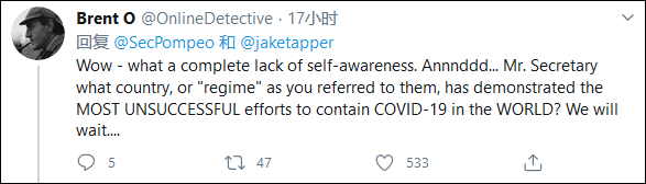 还有一名网友则批评蓬佩奥“太没皮没脸了”,反问道:“国务卿先生,那你说哪个国家或政权在抗击新冠肺炎疫情方面做得最差劲?在线等一个答案……”