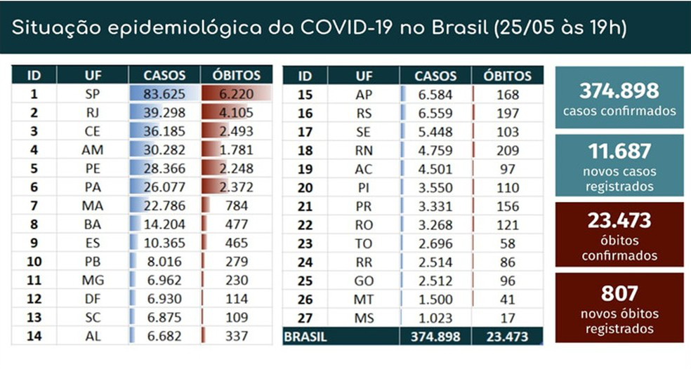 据巴西卫生部25日公布的数据,该国单日新增11687例新冠肺炎确诊病例,累计确诊374898例,新增死亡807例,累计死亡23473例,累计治愈153833例。