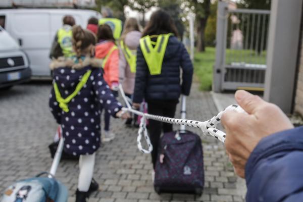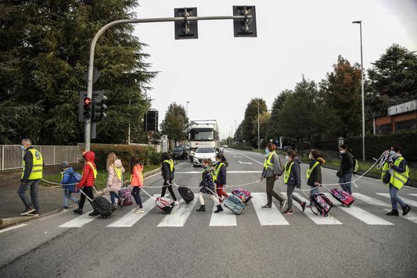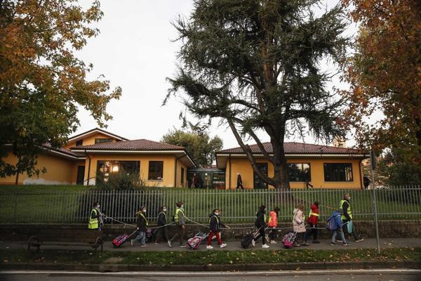 当地时间2020年10月20日,意大利北部贝卢斯科,孩子们拿着绳子保持社交距离,在志愿者的护送下走向学校。据意大利卫生部门最新发布的新冠患者住院统计资料显示,全国已有17个大区患者住院人数超过了封锁期间的数量。(供图:澎湃影像)