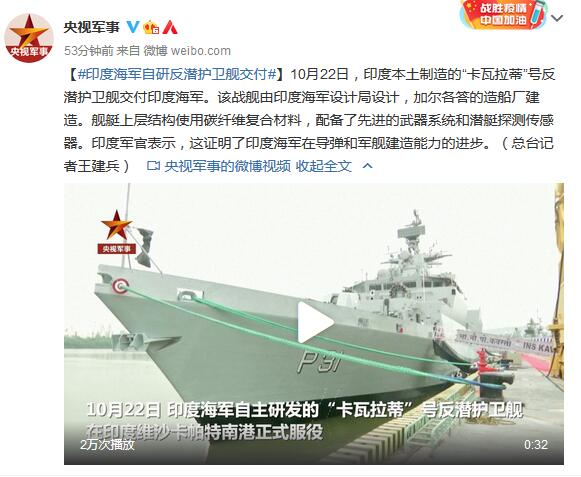 据@央视军事消息,10月22日,印度本土制造的“卡瓦拉蒂”号反潜护卫舰交付印度海军。该战舰由印度海军设计局设计,加尔各答的造船厂建造。舰艇上层结构使用碳纤维复合材料,配备了先进的武器系统和潜艇探测传感器。印度军官表示,这证明了印度海军在导弹和军舰建造能力的进步。(总台记者王建兵)