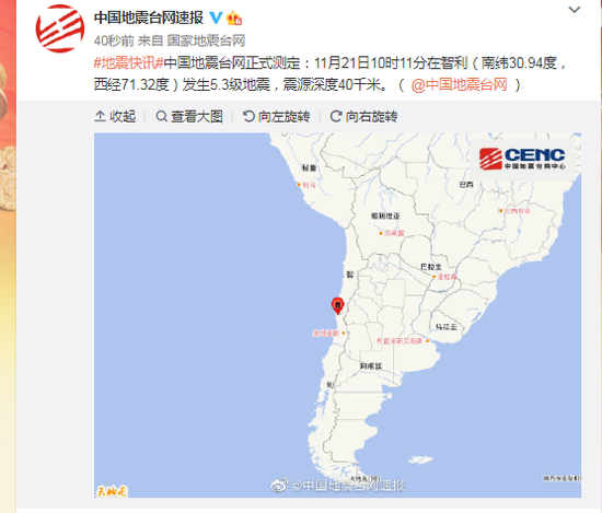 中国地震台网正式测定:11月21日10时11分在智利(南纬30.94度,西经71.32度)发生5.3级地震,震源深度40千米。