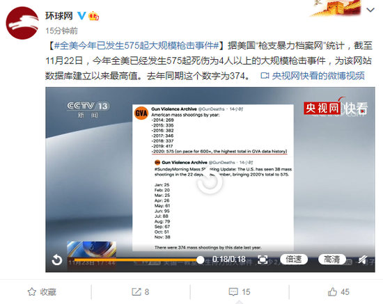 据美国“枪支暴力档案网”统计,截至11月22日,今年全美已经发生575起死伤为4人以上的大规模枪击事件,为该网站数据库建立以来最高值。去年同期这个数字为374。