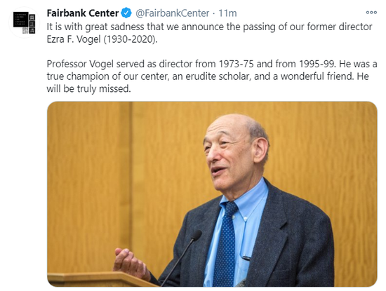 海外网12月21日电 当地时间20日,哈佛大学费正清中国研究中心在推特上发布消息称,著名中美问题学者、研究中心前主任傅高义(Ezra F。 Vogel)去世,终年90岁。推文写道,傅高义长期以来支持研究中心,是一位智慧的学者和出色的朋友,将会深刻怀念他。