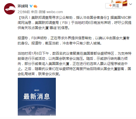 原标题:快讯!美联邦调查局寻求公众帮助,指认冲击国会者身份
