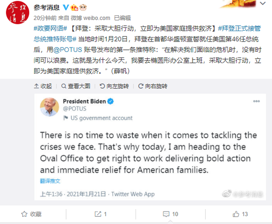 当地时间1月20日,拜登在首都华盛顿宣誓就任美国第46任总统后,用@POTUS 账号发布的第一条推特称:“在解决我们面临的危机时,没有时间可以浪费。这就是为什么今天,我要去椭圆形办公室上班,采取大胆行动,立即为美国家庭提供救济。”(薛帆)
