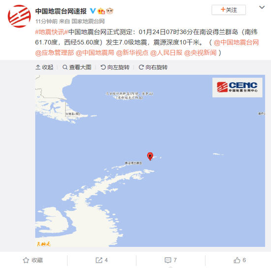 中国地震台网正式测定:01月24日07时36分在南设得兰群岛(南纬61.70度,西经55.60度)发生7.0级地震,震源深度10千米。( @中国地震台网 @应急管理部 @中国地震局 @新华视点 @人民日报 @央视新闻 )