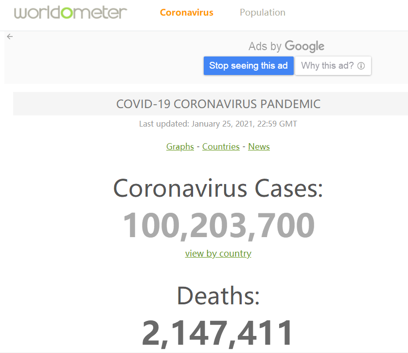 [环球网快讯]根据一直追踪全球新冠肺炎疫情数据的worldometer发布的实时统计数据显示,截至北京时间2021年1月26日7时,全球新冠肺炎累计确诊病例已经超过1亿例,达到100203700例,累计死亡病例超过214万例,达到2147411例。