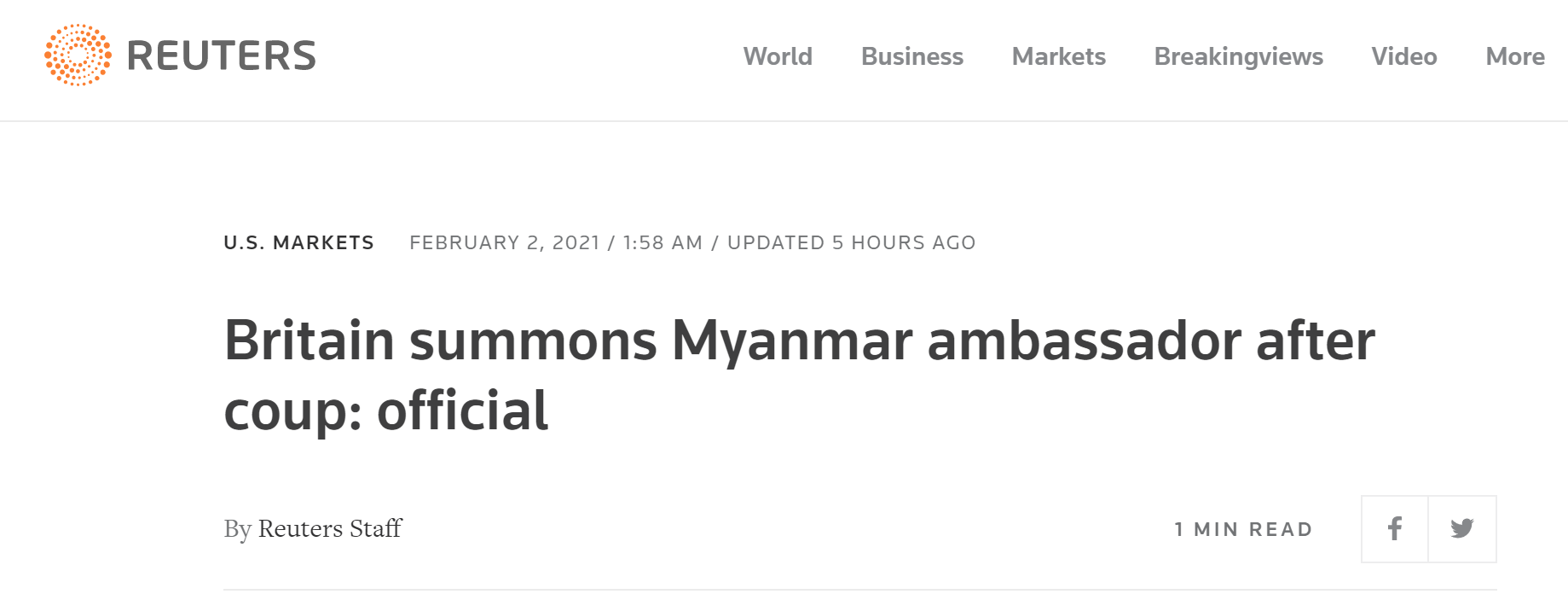 [环球网报道]路透社消息,在英国首相约翰逊发声谴责缅甸军方发动“政变”后,英国外交部一位官员透露,当地时间2月1日,英国召见了缅甸驻英大使。
