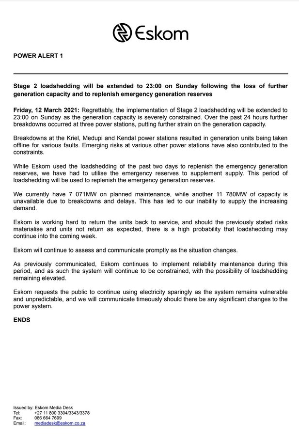 南非国家电力公司曾宣布由于Kusile、Tutuka和Duvha发电站部分发电机故障,需要更换,及补充应急发电储备,南非3月10日(周三)17点至3月12日 (周五)23点,南非将进行2级全国减负断电(两天停电六次,每次1小时)。然而3月12日南非国家电力公司称三家发生故障的发电站再发事故,南非将延长全国减负断电时间至3月14日23点。