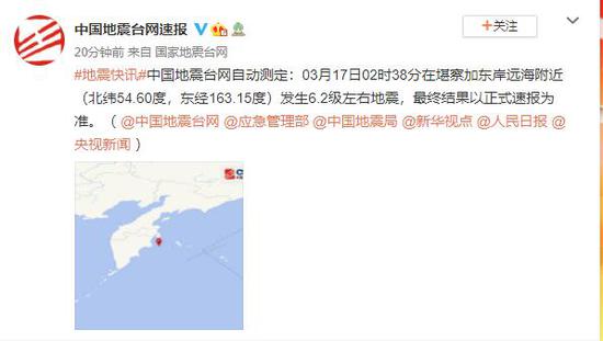 #地震快讯#中国地震台网自动测定:03月17日02时38分在堪察加东岸远海附近(北纬54.60度,东经163.15度)发生6.2级左右地震,最终结果以正式速报为准。
