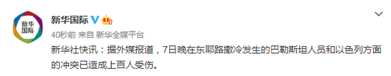 新华社快讯:据外媒报道,7日晚在东耶路撒冷发生的巴勒斯坦人员和以色列方面的冲突已造成上百人受伤。