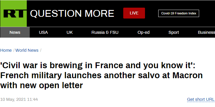 4月21日,《现实价值》周刊刊登包括25名将军在内的1500名军人联合签署的公开信。这封信名为“为了国家领导人荣誉的回归”,信中直接以总统马克龙作为第一对象,称“反种族歧视主义正在法国制造仇恨,鄙视法国文化价值,攻击法国历史。而伊斯兰极端主义和郊区刁民正在分裂国家,试图让法国变成屈服于违宪教条的领土。警察被当作社会冲突的替罪羊,中学老师被斩首”。他们呼吁马克龙必须捍卫爱国主义,因为如果不采取行动,明天将爆发内战,“战士们将为保护我们的价值陷入险境,而您将为因此而牺牲的、成千上万条人命负责”。