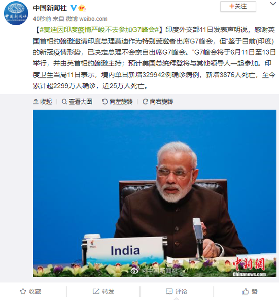 原标题:莫迪因印度疫情严峻不去参加G7峰会