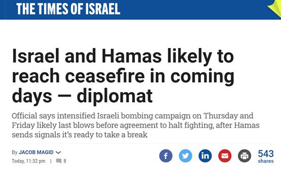 [环球网报道 记者 张晓雅]据《以色列时报》最新消息,一位外交知情人士当地时间14日透露,以色列和巴勒斯坦伊斯兰抵抗运动(哈马斯)可能在未来几天内达成停火协议。