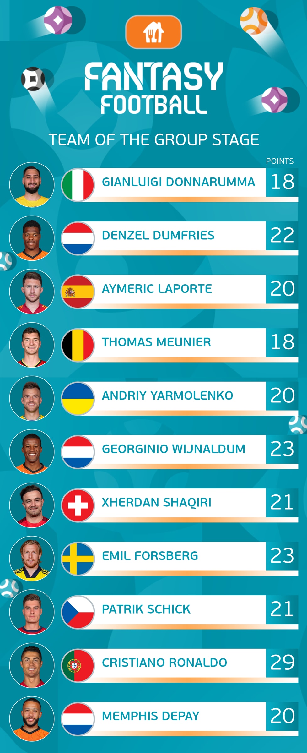 原标题:欧洲杯小组赛最佳阵容出炉 C罗获最高分领衔入选