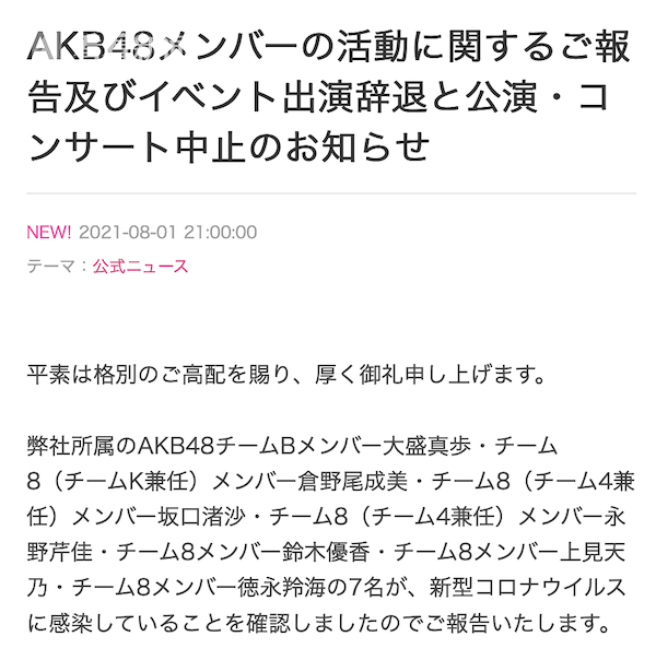 8月1日晚,日本女子偶像组合AKB48在网上公布消息称,因7名成员新冠病毒检测呈阳性,决定暂停原定于8月2日、6日、7日以及8日举行的演出。