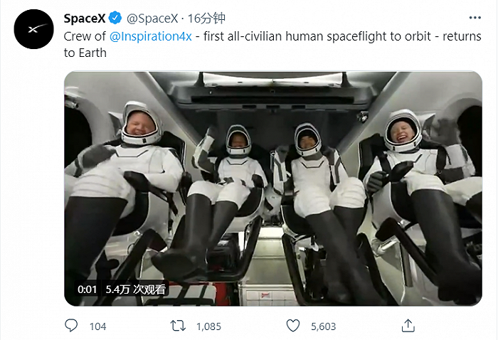 9月19日消息,SpaceX表示,首次“全平民”太空“旅行团”Inspiration4X的航天员已经返回了地球。 此前,在当地时间15日晚8时02分,Inspiration4X首次搭载全民用机组人员进入轨道,完成为期三天的任务。