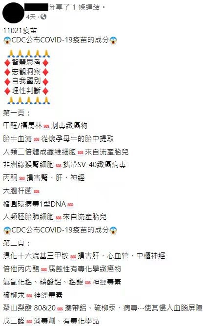 近日,国外社交平台流传的消息称,美国疾病预防与控制中心(CDC)公布了新冠疫苗的成分,其中含有甲醛、丙酮、硫柳汞等对人体有害的致癌物质,还含有来自流产胎儿的二倍体细胞。