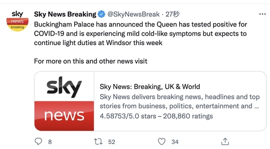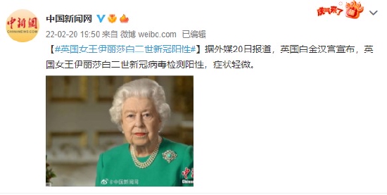 [英国女王伊丽莎白二世新冠阳性]据外媒20日报道,英国白金汉宫宣布,英国女王伊丽莎白二世新冠病毒检测阳性,症状轻微。
