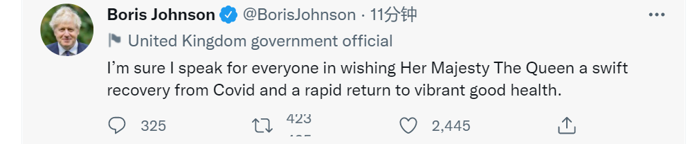 [环球网报道]刚刚,英国首相约翰逊发推祝愿女王早日康复。此前,白金汉宫表示,英国女王新冠病毒检测呈阳性。