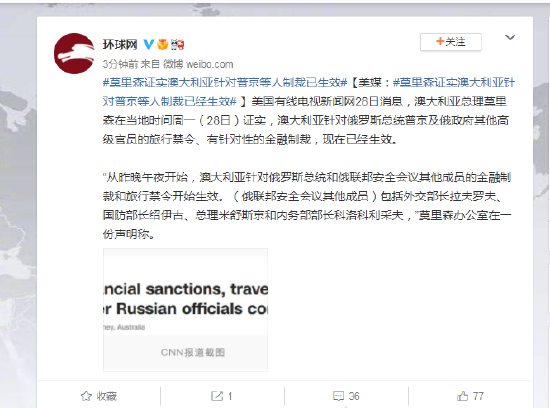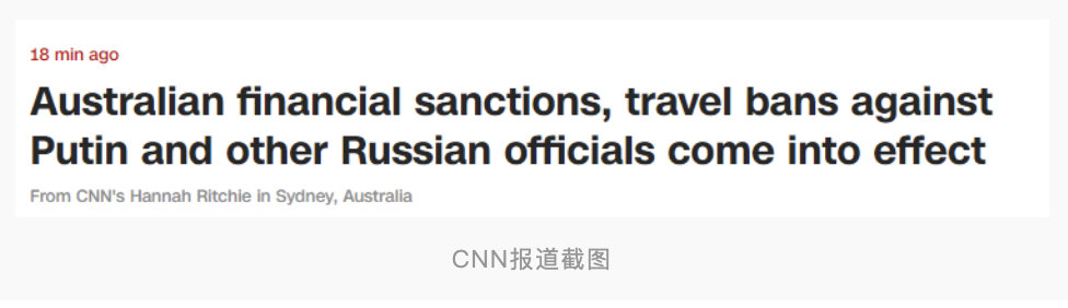 美国有线电视新闻网28日消息,澳大利亚总理莫里森在当地时间周一(28日)证实,澳大利亚针对俄罗斯总统普京及俄政府其他高级官员的旅行禁令、有针对性的金融制裁,现在已经生效。