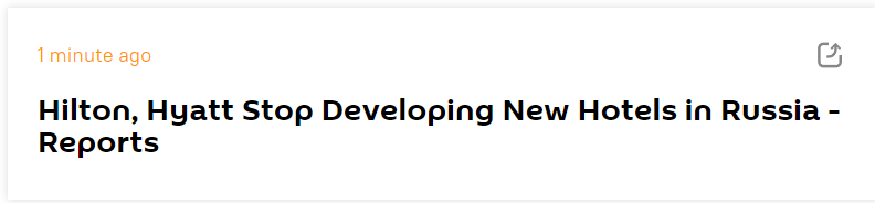 [环球网快讯]俄罗斯卫星通讯社10日刚刚消息,据报道,希尔顿集团,凯悦集团停止在俄罗斯发展新酒店业务。