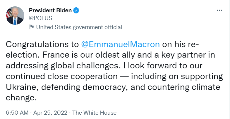 拜登发推称,“祝贺马克龙连任!法国是我们最古老的盟友,也是应对全球挑战的关键伙伴。我期待我们继续密切合作,包括在支持乌克兰、捍卫民主和应对气候变化问题上。”