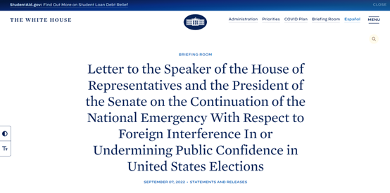 拜登在信中称, 依据美国《国家紧急状态法》有关规定,“我已向《联邦公报》发送了一份随附通知,为应对外国干涉或破坏公众对美国选举的信心而产生的威胁,于2018年9月12日第13848号行政命令宣布的国家紧急状态,将在2022年9月12日后继续有效。