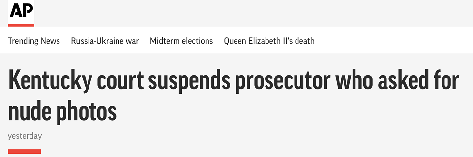 [环球网报道]据美联社18日报道,美国一名联邦检察官被曝答应帮助一名女性被告以换取其裸体照片,肯塔基州最高法院于当地时间16日将该名检察官停职。
