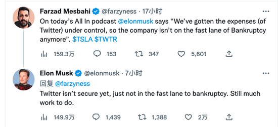 马斯克表示,推特目前没有破产的危险。